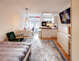Cocina abierta al salón y separada por una barra, con ventana, horno de inducción, horno con microonda integrada, máquina para cocinar al vapor, frigorífico con congelador, lavavajillas, hervidor de agua, tostadora de pan, completa con platos