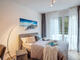 cocina de apartamento, frigorífico con congelador, lavavajillas, horno de cerámica, horno eléctrico, mesa de comer, completa con platos