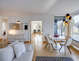 Muebles de cocina integrados, con ventana, frigorífico con congelador, lavavajillas, horno de cerámica, horno eléctrico, extracción, hervidor de agua, cafetera automática, mesa con 2 sillas, completa con platos