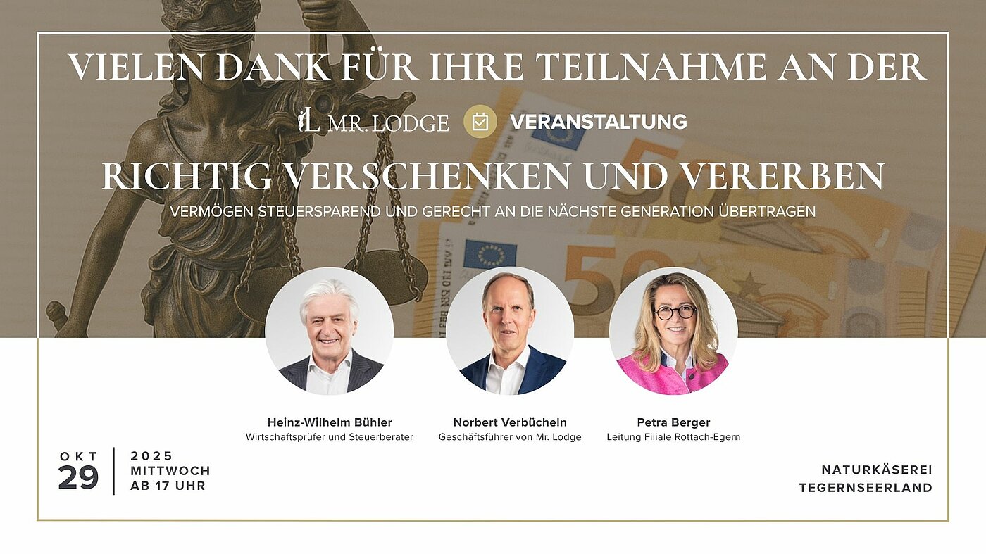 El 29 de octubre de 2025 organizamos un acto informativo en la quesería Naturkäserei TegernseerLand de Kreuth. Bajo el lema "Donar y legar correctamente: transmitir el patrimonio a la siguiente generación de forma justa y ahorrando impuestos", el auditor y asesor fiscal Heinz-Wilhelm Bühler, de WirtschaftsTreuhand GmbH, ofreció información sobre formas prácticas de sucesión patrimonial.