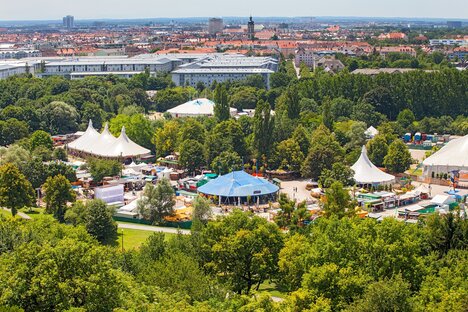 Parque Olímpico con pequeño lago, instalaciones deportivas y piscina cubierta, conciertos, partidos de fútbol y el "Tollwood" de verano con mercado de artesanía, circo y conciertos