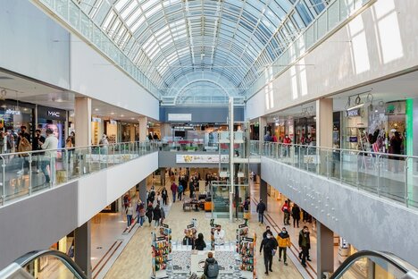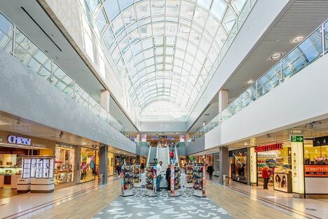Calle comercial con muchas tiendas pequeñas, centro comercial "OEZ"
